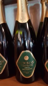 Vårt första möte med trentodoc-vinet i Italien var på första middagen i Trento. Vi valde en lite bättre restaurang på Piazza di Duomo och tog in ett glas Altemasi, brut millesimati från 2012 som drink före maten. Nu ska man ju inte underskatta inramningens betydelse för smakupplevelsen – restaurangen var fantastiskt pittoresk, kvällen var ljummen, sällskapet var hänförande och staden Trento jättevacker. Men vinet var faktiskt jättebra: det var väldigt milt, med fina lena bubblor. Det hade balanserad syra. Med stora klunkar fick vi med lite av skalbeskan, men det fanns också toner av persika och passionsfrukt. Vilket trevligt möte!