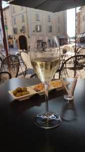 Mitt första stopp blev på La Vie en Rose mitt på torget bakom vårt hotell, Piazza Garibaldi. Där hade de inte mindre än tre franciacortor på glas. Jag beställde ett glas Ca’ d’or för 5 euro inklusive oliver, jordnötter och kex.
