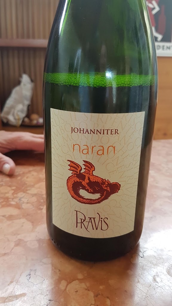 Naran är ett mousserande vin som gjord på johanniterdruvan. Johanniter är en druva som är framavlad för att vara mögelresistent, en korsning mellan riesling och tre andra äldre druvsorter. Vi var inte så imponerade av vinet. Våra smaklökar är ju väldigt bortskämda efter snart två veckors vinprovande. Det hade smak av rödbetor som inte var fel i och för sig, men det var lite för beskt. Moussen var dock bra med små bubblor.